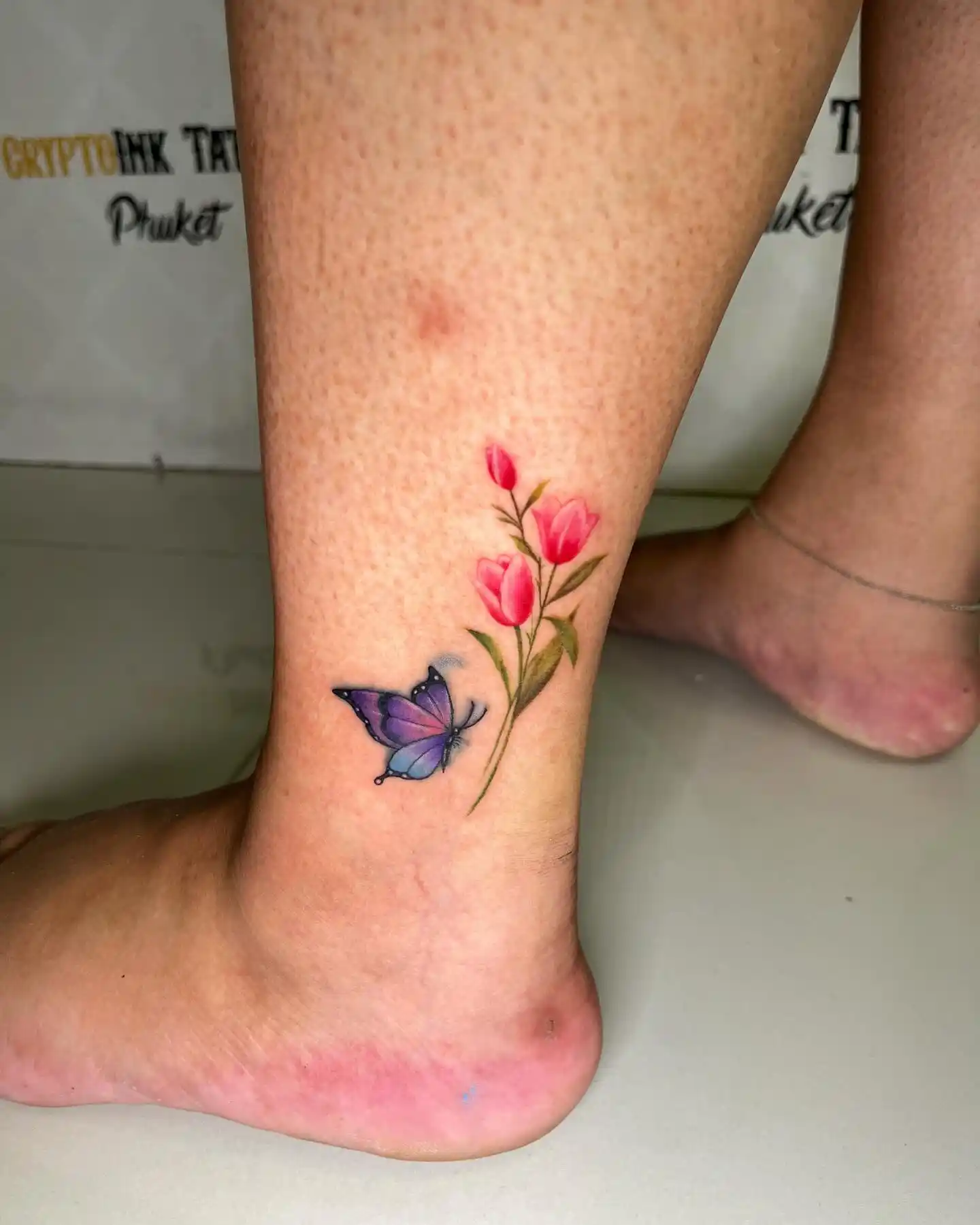 Here’s a little daydream on your ankle. That lilac-and-blue butterfly floating next to delicate tulip blooms? It’s giving “calm energy but still a little extra.”