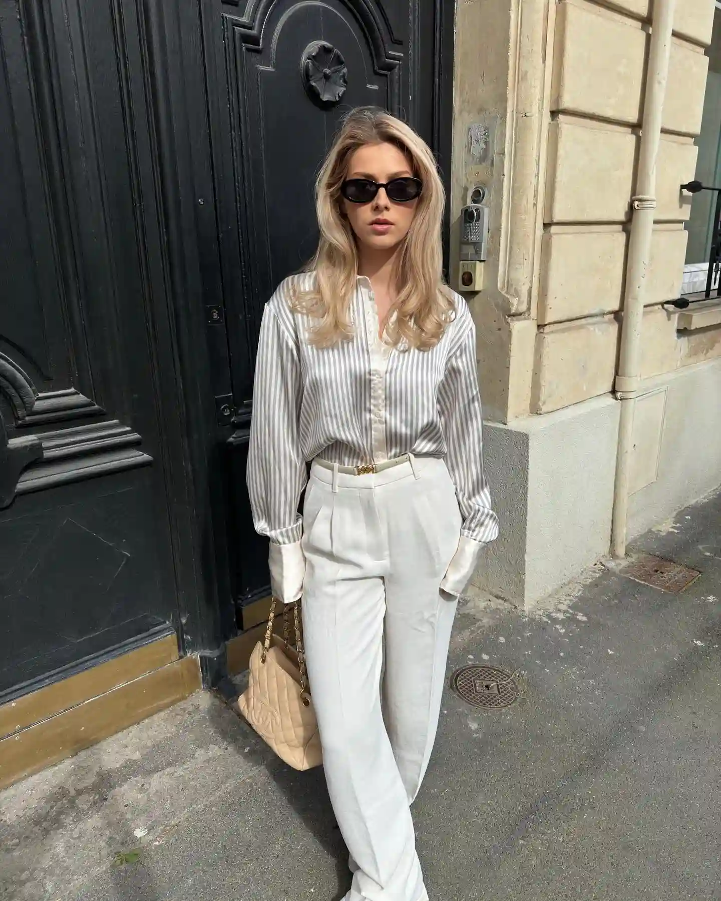 A silky button-down shirt with refined stripes, neatly tucked into tailored high-waisted trousers, looks stunning without any fuss.